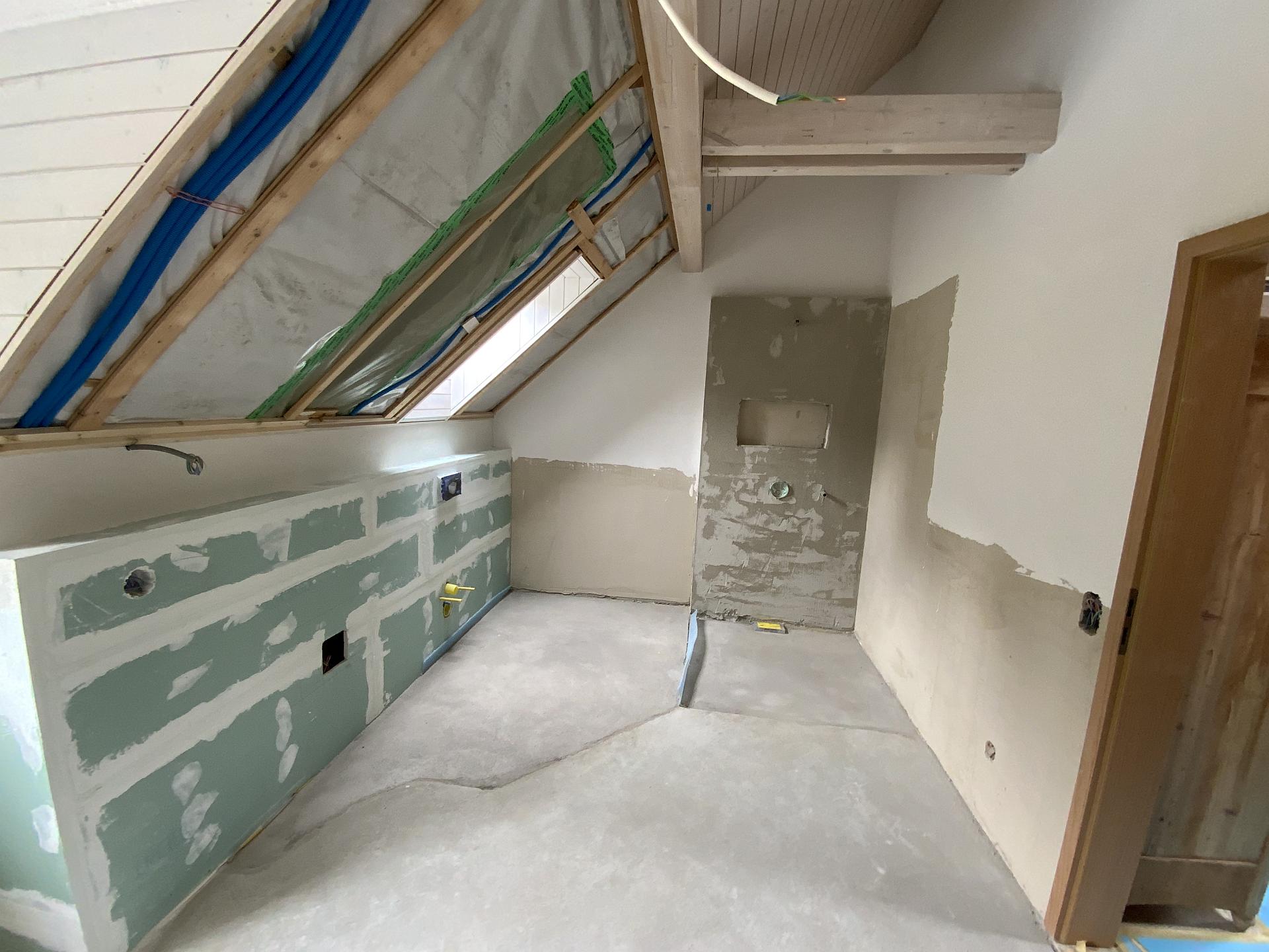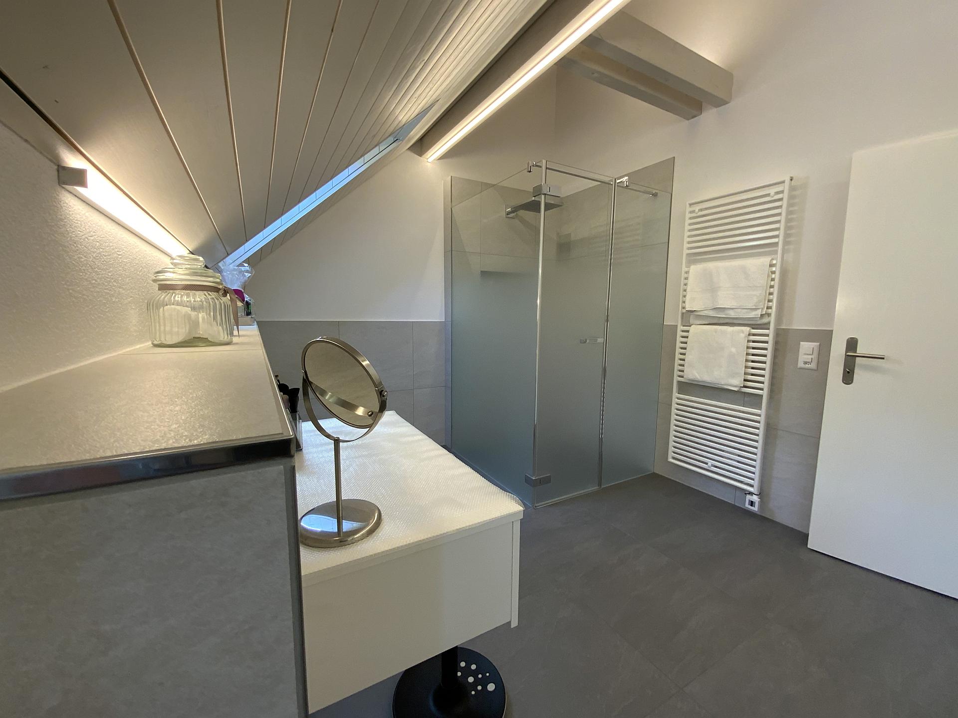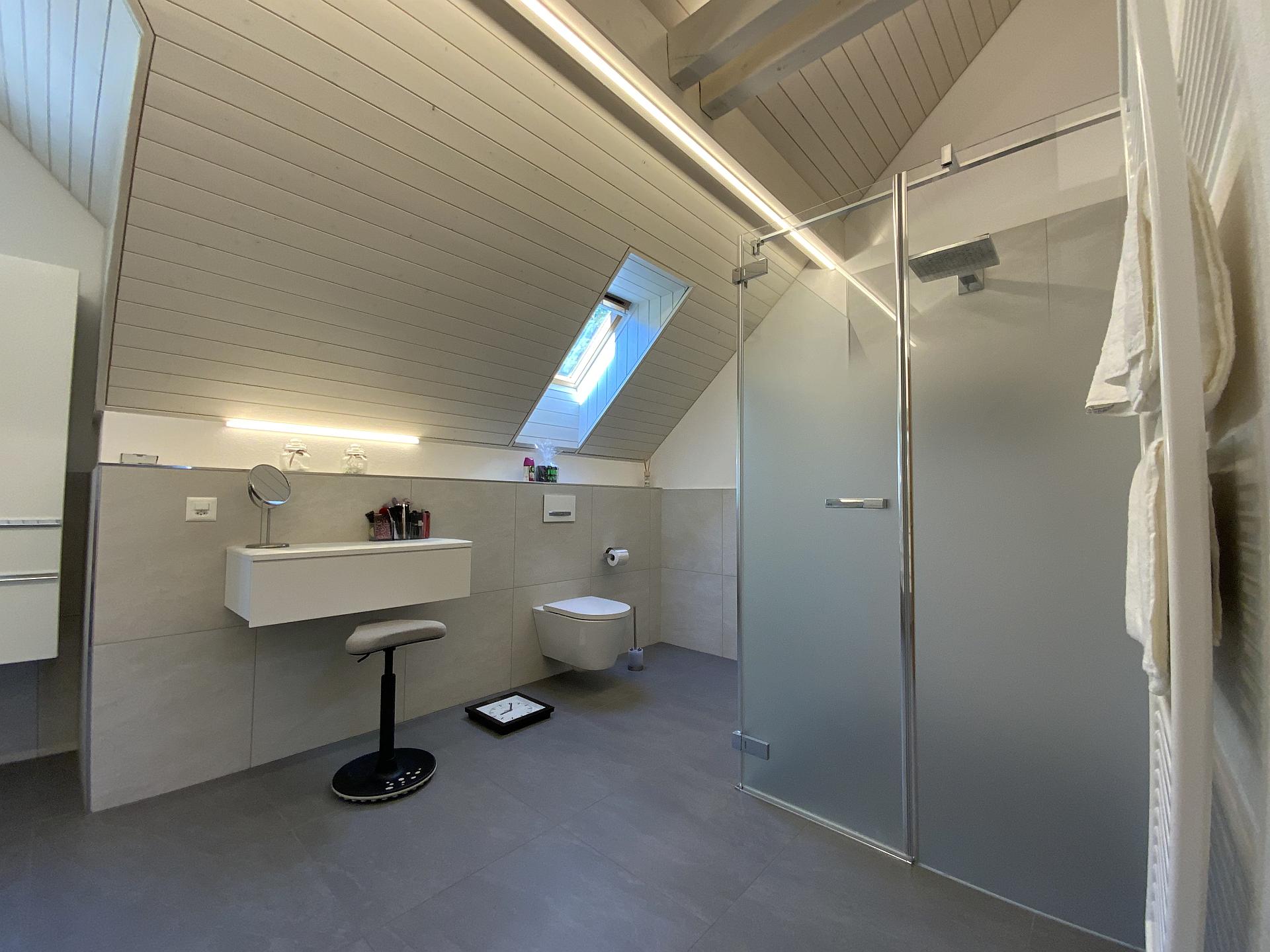 Bad Sanierung, Mägenwil. Entfernen der Badewanne mit Ummauerung und neue Walk In Dusche, Schaffung eines neuen Raumgefühls.